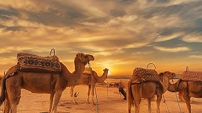 Experience the stony landscape of the Agafay Desert on a camel trek, culminating in a breathtaking sunset over the High Atlas Mountains.
