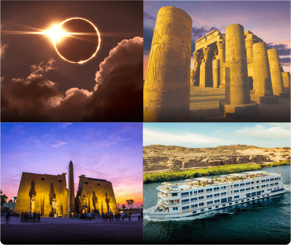 Experience a Total Solar Eclipse on August 2, 2027, from the deck of a luxury Nile cruise—over six minutes of totality in the path of the eclipse, surrounded by Egypt’s timeless landscape.
