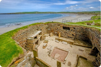 Discovery of the prehistoric world of the Orkney Islands begins with a visit to the remarkably well-preserved Neolithic village of Skara Brae. Inhabited over the course of six centuries from ~3180 to ~2500 BCE, it predates both Stonehenge and the Great Pyramids. The site consists of eight stone-built houses, connected by covered passageways, with furniture (stone beds and chairs) still intact. Constructed partially underground to protect it against harsh winds, the settlement invites reflection on the resilience and resourcefulness of those who eked out an existence in such barren conditions.