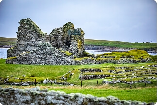 Continue to the extraordinary archaeological site of Jarlshof, uncovered by a violent storm in the winter of 1897. Years of excavation have revealed layer upon layer of stone structures spanning at least 5,000 years of human history: late Neolithic houses; a Bronze Age village; an Iron Age broch; several Norse longhouses; a medieval farmstead; and the 16th-century laird’s house.
